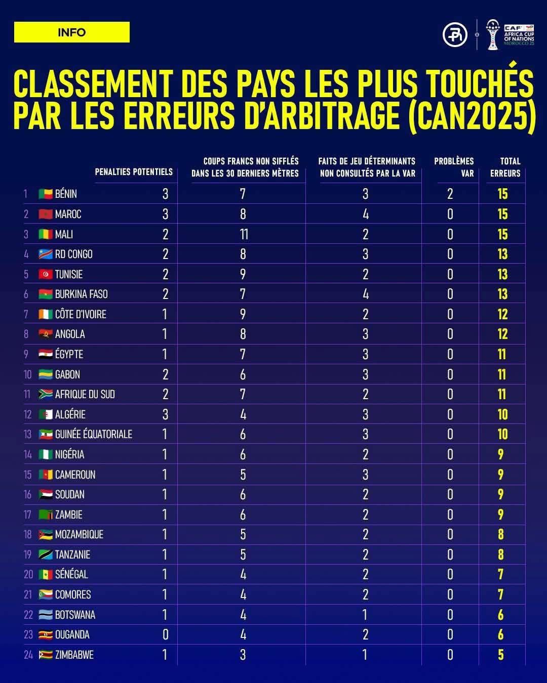 وبحسب هذه الإحصائيات، تصدرت منتخبات بنين والمغرب ومالي قائمة الأكثر تضررا، بعدما سجل كل منتخب منها 15 حالة تحكيمية مؤثرة، وهو أعلى رقم تم رصده في البطولة إلى غاية هذا الدور.